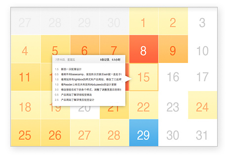 不同颜色代表不同工作强度,点击某天可以看到当天的具体工作内容。